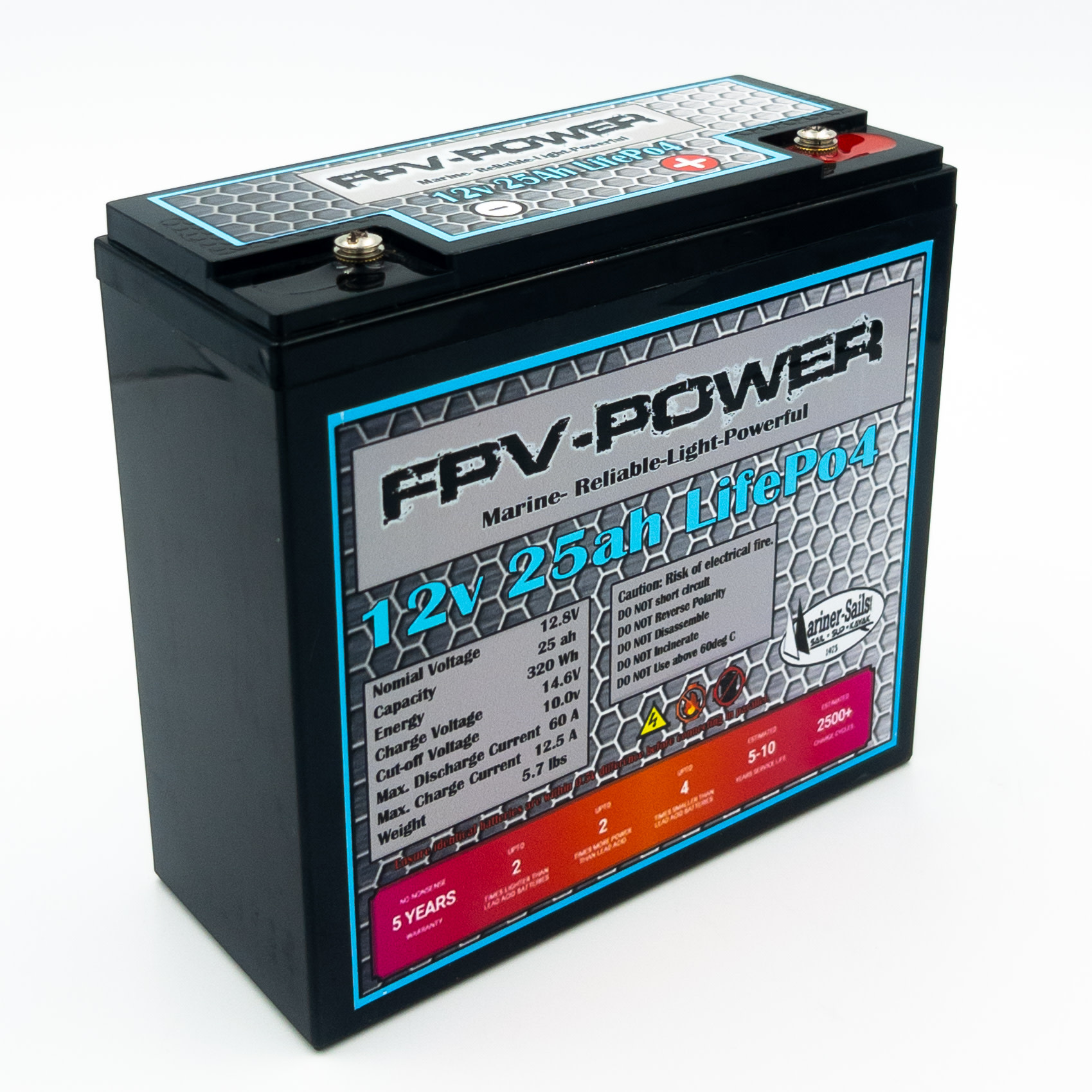 FPV-Power LiFePO4 batteries are smaller and lighter than other brands. LiFePO4 is the longest lasting battery technology providing over 2000 charging cycles. FPV-Power LiFePO4 batteries are backed by a 5 year "no nonsense" warranty*.