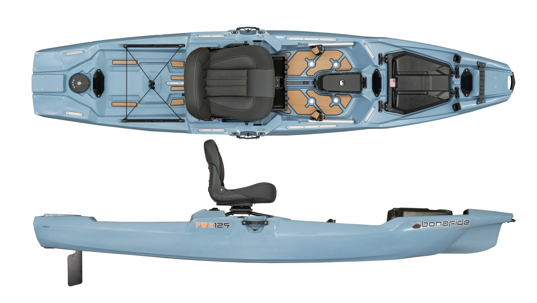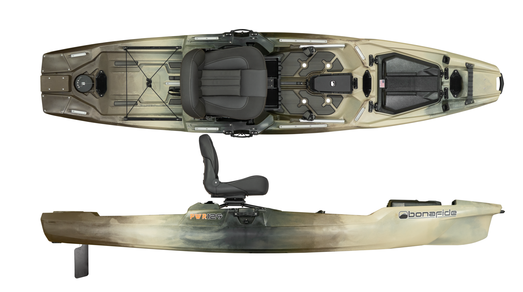 Introducing the Bonafide PWR 129 - an innovative fishing kayak optimized for power through an intelligent design focused on motorization and electronics integration. This stable, efficient kayak gives anglers the freedom to go further and stay out longer on the water. This is ultimate fishability whether through paddle or power.