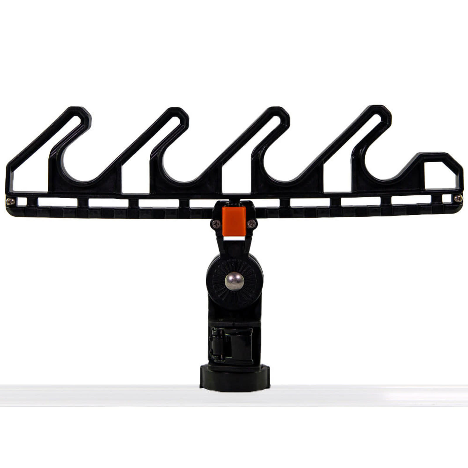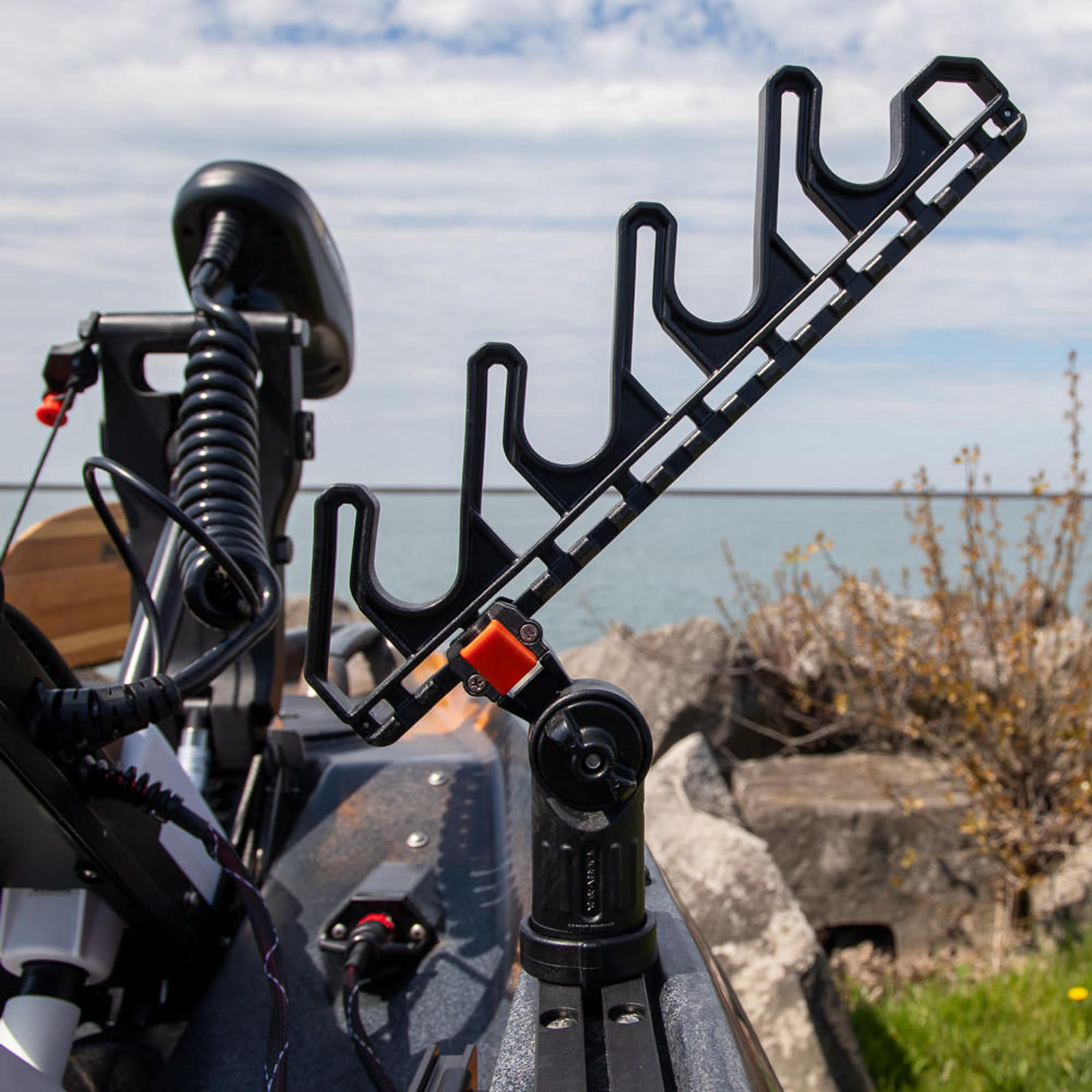 It’s time for rod organization to take center stage. For years forward rod staging has fallen a little short. Many kayak manufactures have designed geometry in the kayak’s hull or the front hatch for rod staging, but none have really risen to the occasion. The CenterStage Rod Stager is a track mounted forward rod stager designed for use with up to four rods that utilizes our LockNLoad system to attach to your kayak’s track. From there you get the full maneuverability that the LockNLoad system offers, plus the adjustability of our new ClickTrac Rail system. The integrated ClickTrac Rail on the bottom of the stager allows you to adjust side to side with a click of a button to achieve the desired position. The CenterStage Rod Stager is made from Injection-molded, UV stabilized polymers, that will hold even in harsh marine environments.