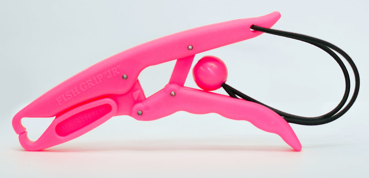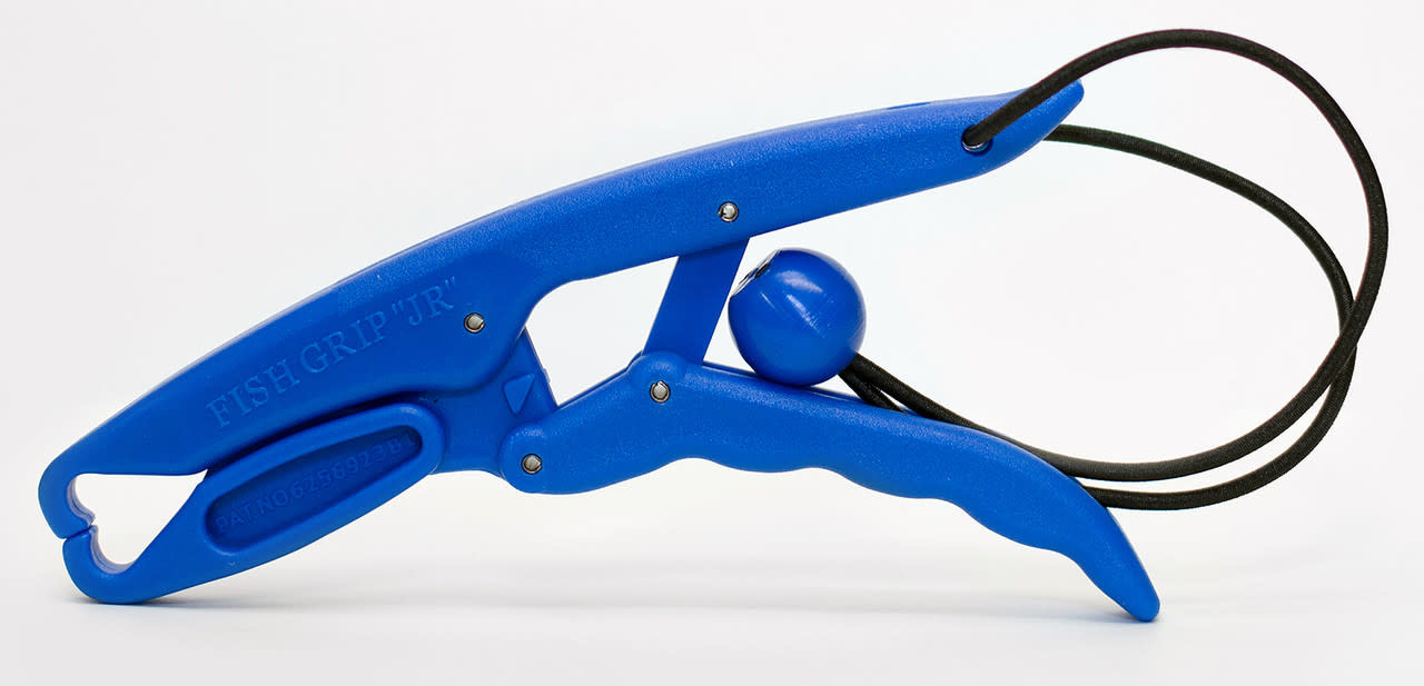 The Fish Grip™ Jr. grabs the fish by the lip and holds it like pliers. Made for smaller fish or hands, it is approximately 7 inches long.