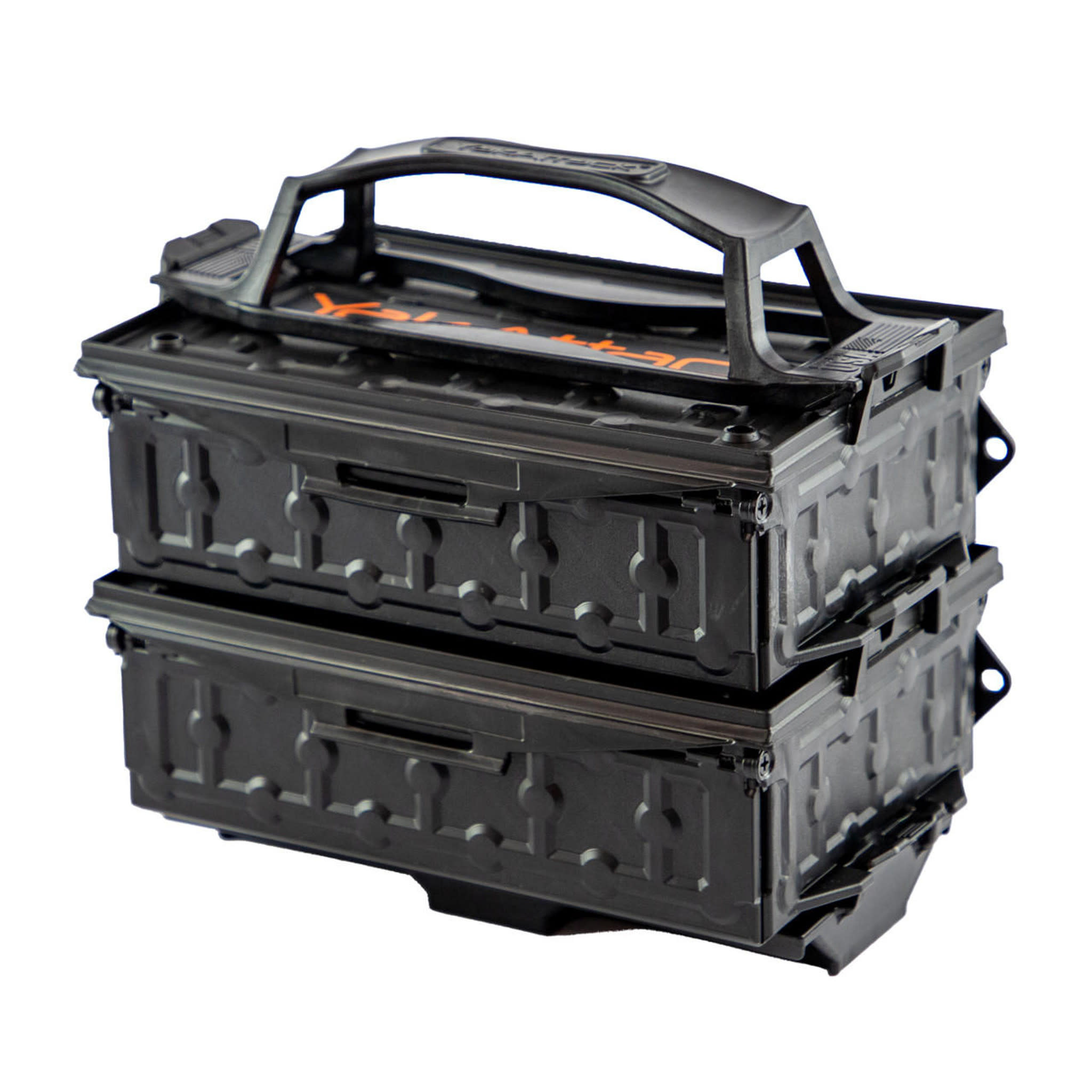 handle shown with several TracPak stackable storage boxes for fishing and kayak fishing