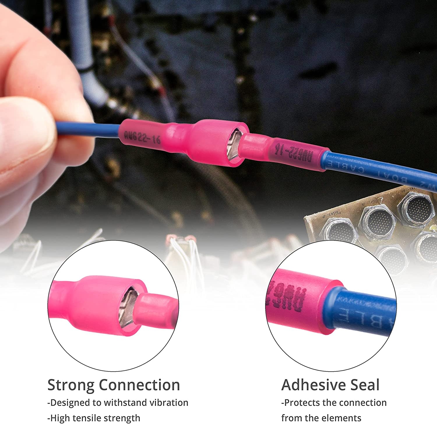 - PROFESSIONAL SPADE CONNECTORS - Our spade connectors are crafted from high quality copper, as well as heat shrink tubing with adhesive lining. These terminals crimp, shrink, and seal well.