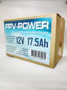 The FPV-POWER 17.5 Ah waterproof kayak battery suits fisherman who run larger fish finders /GPS which typically draw more than 1A. If drawing 1A, you can expect around 17 hours of use, but you may need a voltage regulator as some fish finders need a minimum of 11V to run. The FPV Kayak Battery can be run in parallel to increase your battery capacity. The FPV Battery is rated at IP67 which means it can be submerged to 3ft for up to 30 minutes.