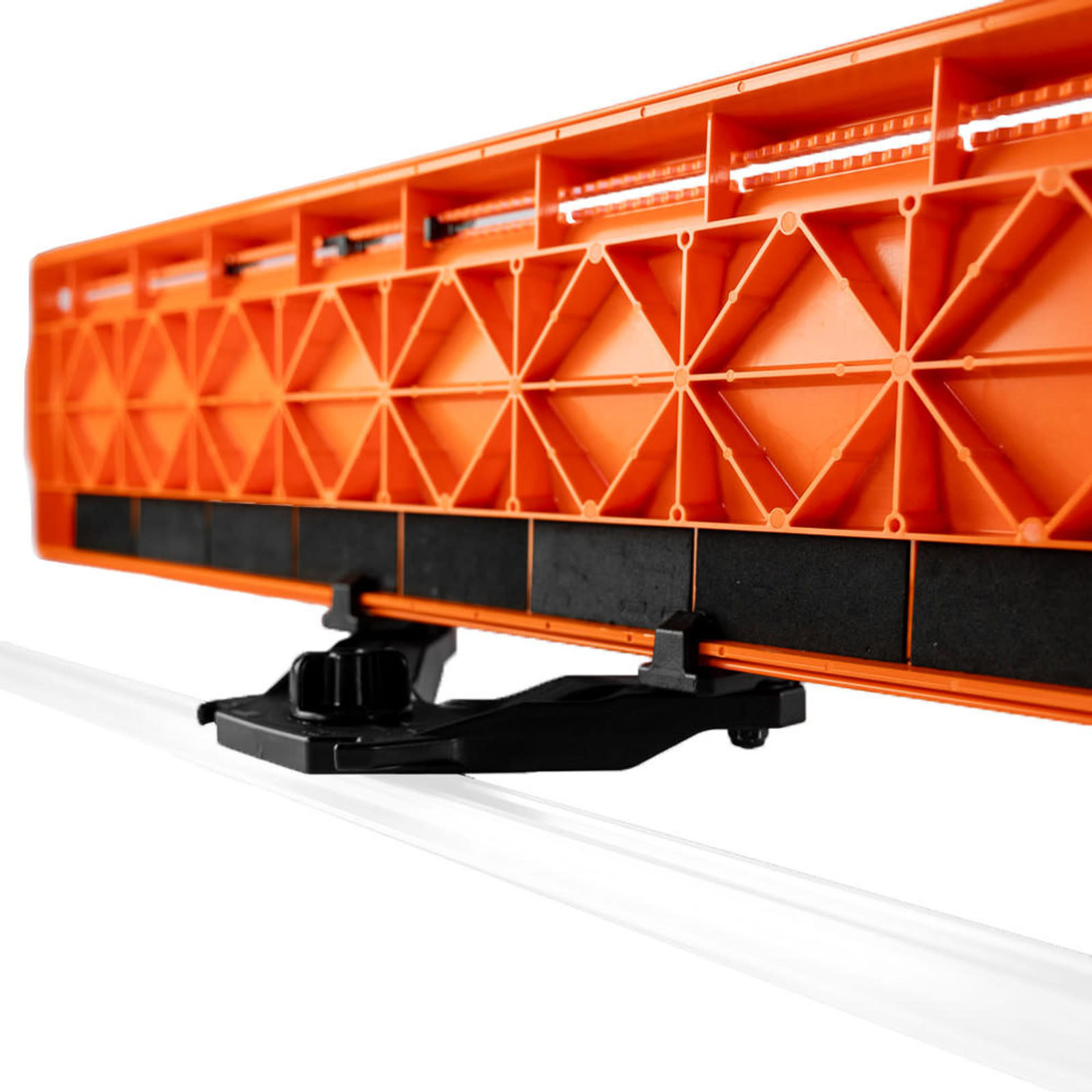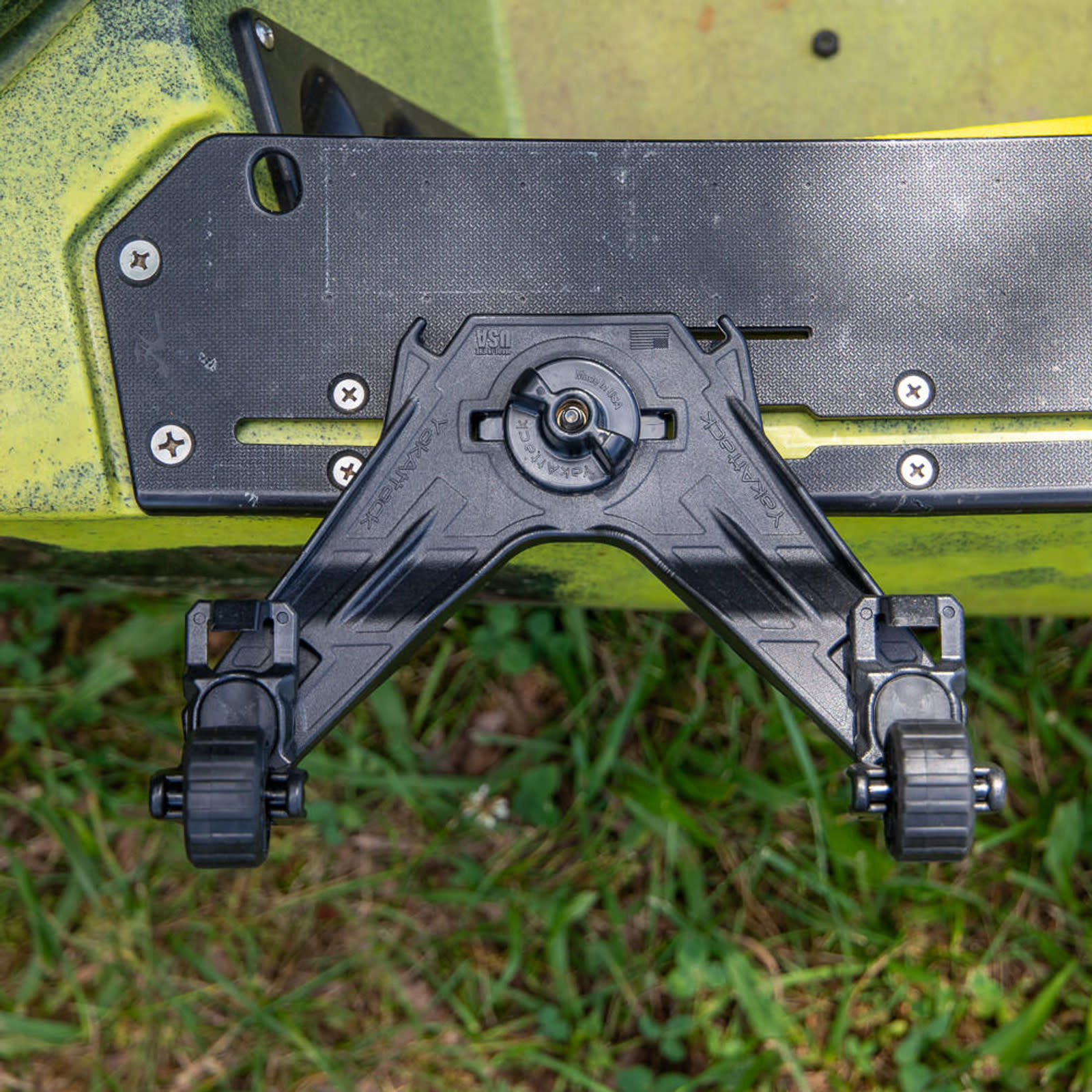 Like the DoubleHeader and its other variations, the LeaderBoard DoubleHeader offers the user a 3.5” offset from a single point of attachment so as not to tie up valuable track space or block the gunnel of your kayak, allowing for the full functionality of other accessories. As mentioned above, the redesigned RotoGrips featured on this DoubleHeader are unique to the shape of the LeaderBoard. Insert the underside of the LeaderBoard into the hooked side of the RotoGrip and rotate the board towards the wheels until it is in a vertical orientation and locked into place. The LeaderBoard will only release in one direction to prevent you from accidentally knocking it out into the water. To release and remove the LeaderBoard, roll the board away from the RotoGrip wheels towards the hooks, and the board will come out with ease.