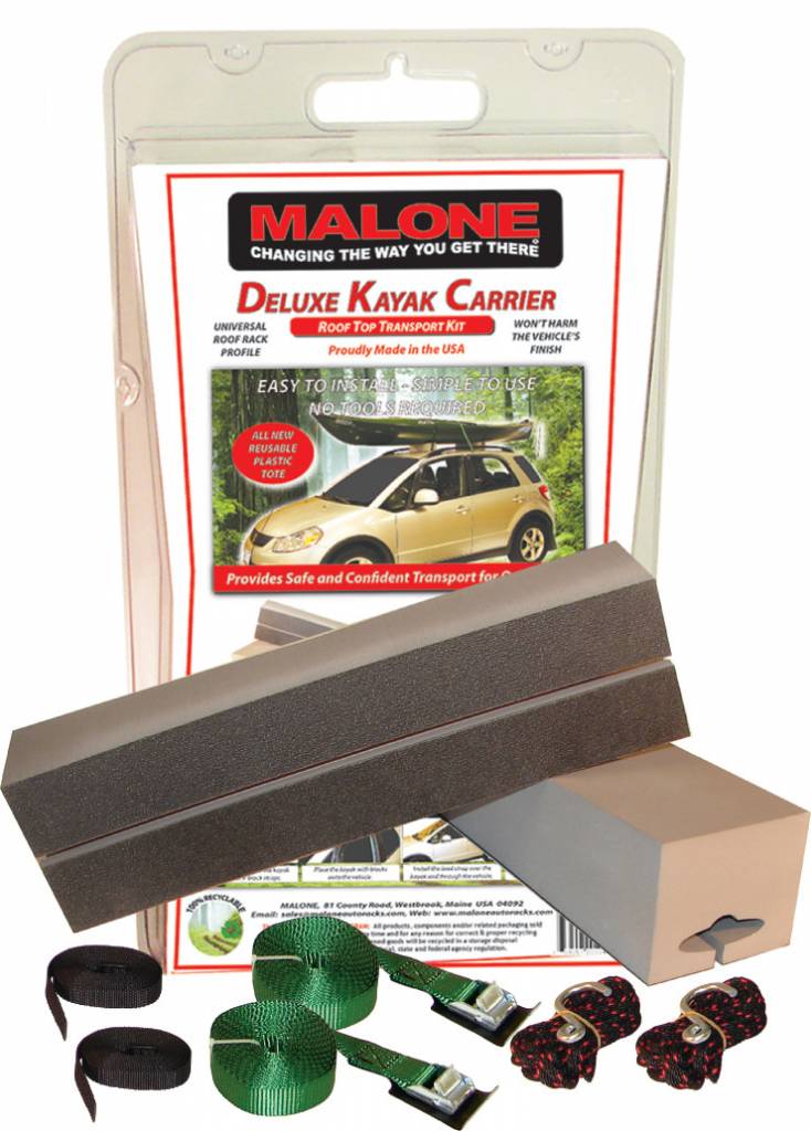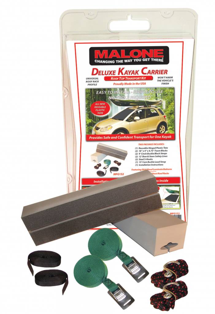 The Malone MPG152 Deluxe Kayak Kit includes everything needed to safely and affordably transport one kayak. The 18" blocks feature a universal cut-out profile that fits round, square and oval load bars. Includes two 15' load straps and safety tie-downs. Made in the USA with the finest EVA closed cell foam.