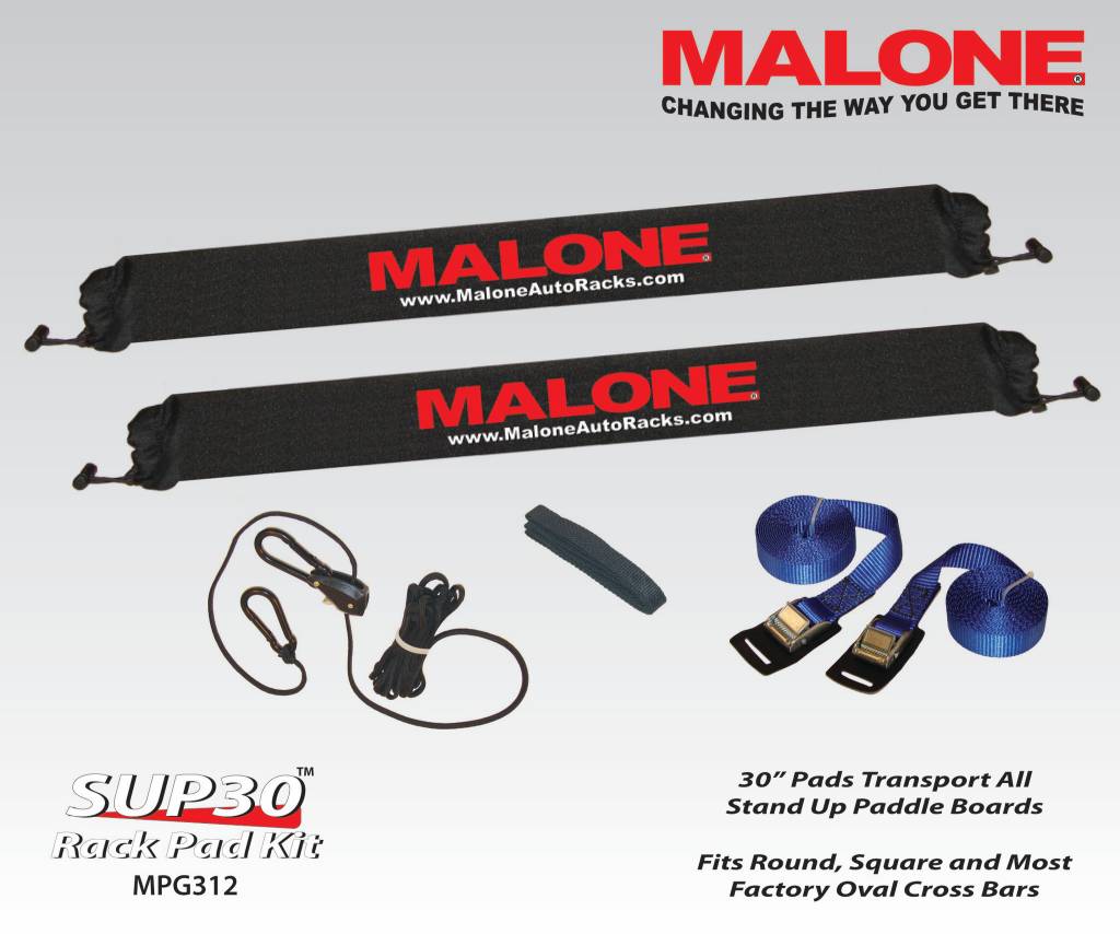 The SUP30 Rack Pad Kit provides safe transport for standup paddle boards. This easy to use, hassle free rack pad system works with round, square and most factory load bars. Features include two fade-resistant nylon weave 30"rack pads, two cam style load straps and a ratchet tie-down with grab loop for safe transport. Includes one year warranty.