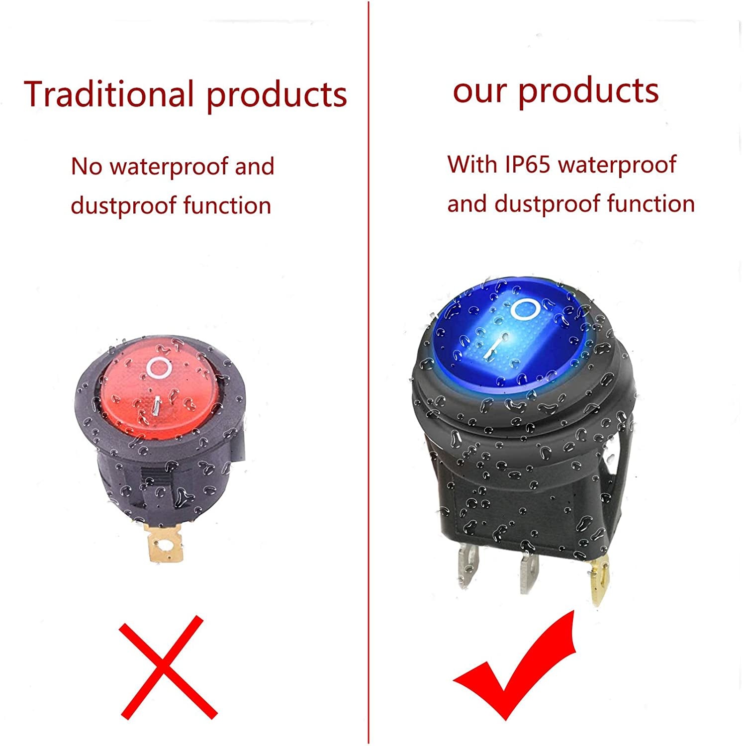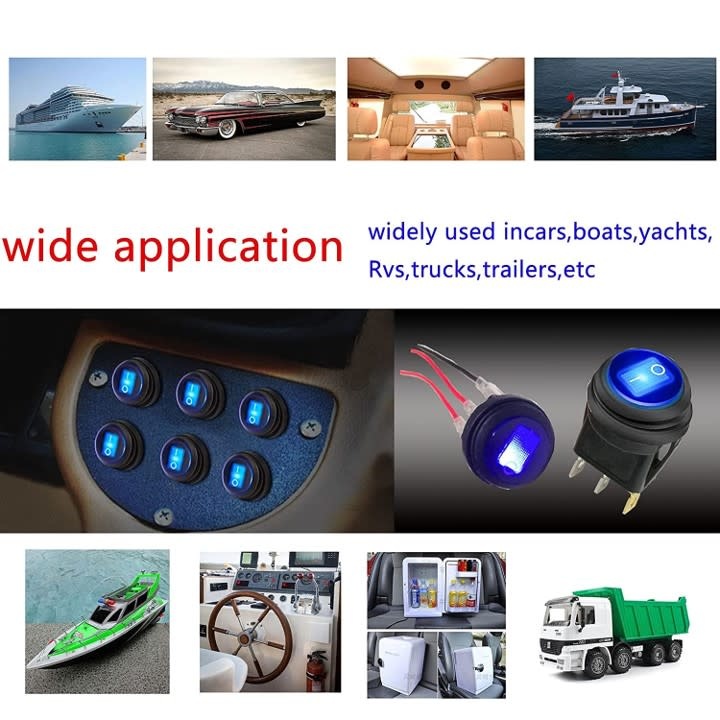 • Materials: Round Waterproof 12V DC illuminated rocker switch is made of nylon 66 and IP65 material. The terminal is made of brass, silver plated.
