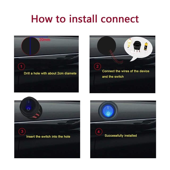 • Installation: The mounting hole size of the round rocker switch is 0.787 inches (20mm). The switch has an easy to install snap-in design.