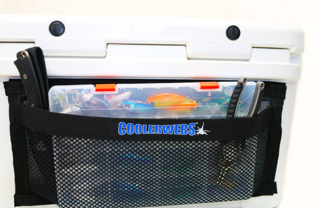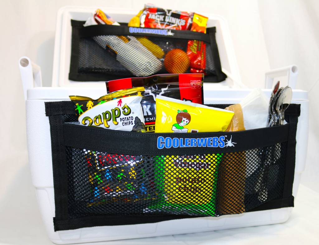 CoolerWebs™ has quickly become the #1 accessory for coolers. CoolerWebs™ utilizes a specially formulated adhesive and design that allows for installation and long term use inside and outside of coolers. This allows for use on the underside of cooler lids allowing for food items to be kept cool without having to sit on/in the ice, keeping cooler items from getting soggy or waterlogged. CoolerWebs™ can be installed along the outside, back or front of coolers to help hold items such as plates, napkins, cutting boards and other essentials.
